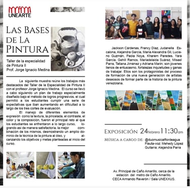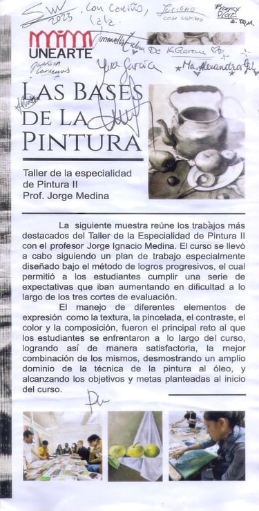 La siguiente muestra reúne los trabajos más destacados del Taller de la Especialidad de Pintura 2 con el profesor Jorge Ignacio Medina. El curso se llevó a cabo siguiendo un plan de trabajo especialmente diseñado bajo el método de logros progresivos el cual permitió a los participantes cumplir una serie de expectativas las cuales iban aumentando en dificultad a lo largo de los tres cortes de evaluación.