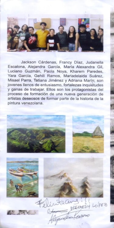 Jackson Cárdenas, Francy Díaz, Judanella Escalona, Alejandra García, María Alexandra Gil, Luciano Guzmán, Paola Noya, Kharem Paredes, Yara García Gheii Ramos, Mariadelaida Suárez Misael Parra, Tatiana Jiménez y Adriana Marín, ellos son jóvenes llenos de entusiasmo, fortalezas, inquietudes y ganas de trabajar, ellos son los protagonistas del proceso de formación de una nueva generación de artistas deseosos de formar parte de la historia de la pintura venezolana.